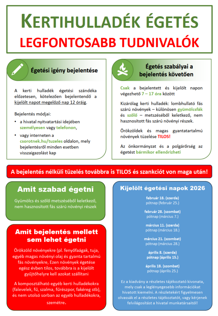 A Csörötnek Község Önkormányzatának a kerti hulladék égetéséről szóló 5/2025. (II.24.) önkormányzati rendeletet (továbbiakban: rendelet) alapján a település közigazgatási területén, az alábbi napokon van lehetőség a kertekben, gyümölcsösökben, szőlőkben történő metszések, faápolások során keletkező fanyesedék elégetésére.